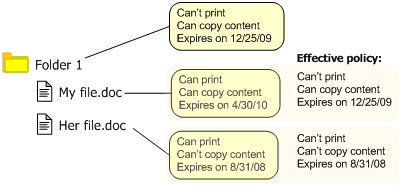 You cannot print My file.doc and Her file.doc because although their own policies allow printing, Folder 1 has a more restrictive policy, which does not allow printing.