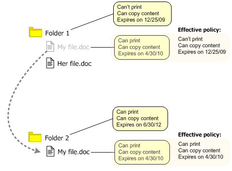 In either of the two preceding cases, folders keep their rights-protection method. That is, if a source folder inherits its policy, it inherits its new parent's policy; if a source folder has its own policy, its actual policy is unchanged, but its effective policy might change, depending on the effective policy of the new location.